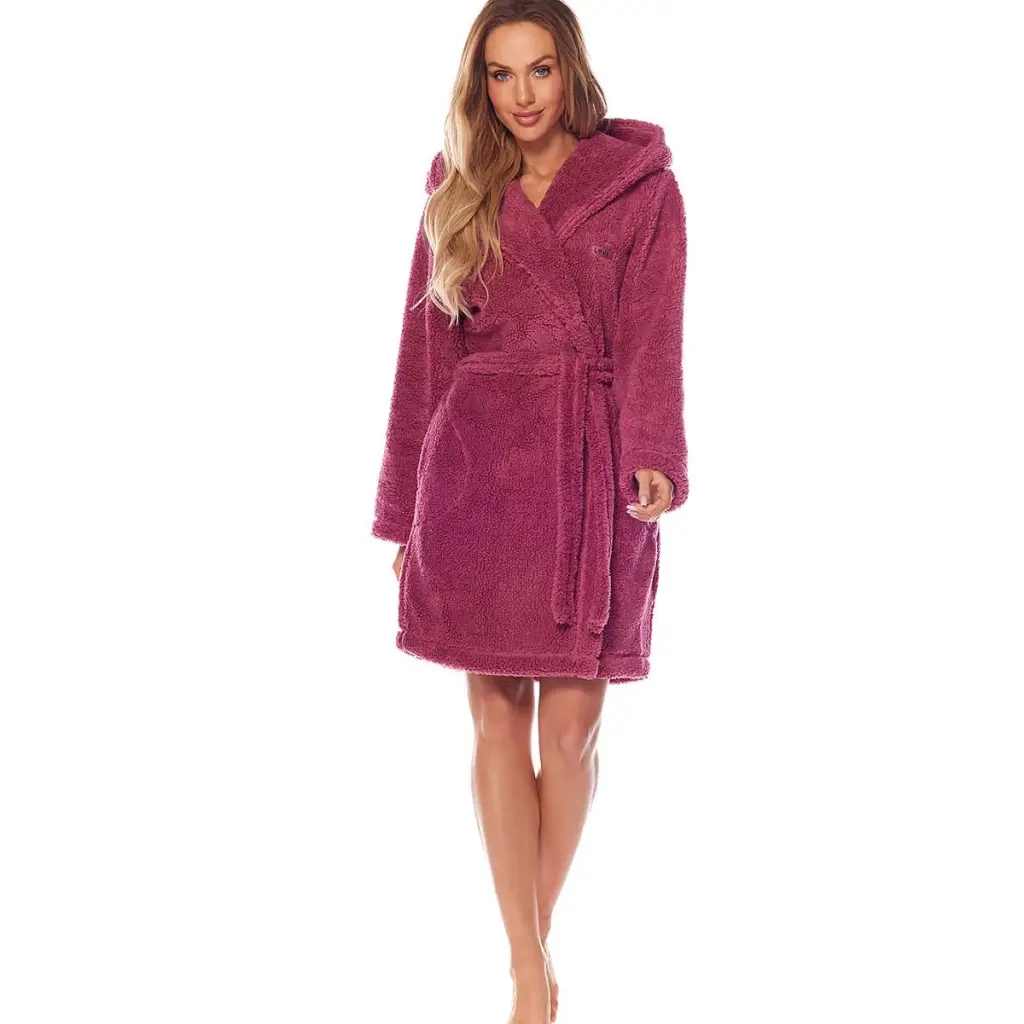 Women's bathrobe made in pleasant warm material. It has a hood and pockets at hip level. Ideal for cold days.