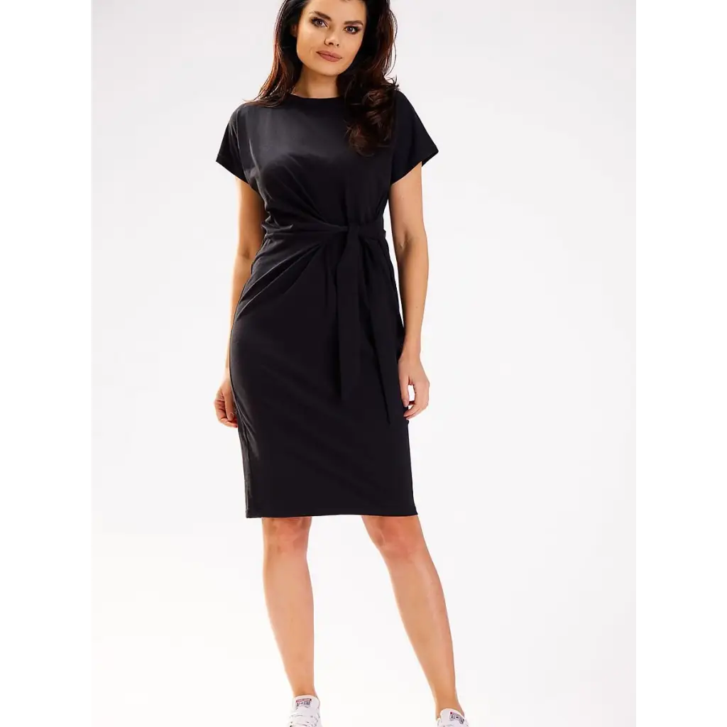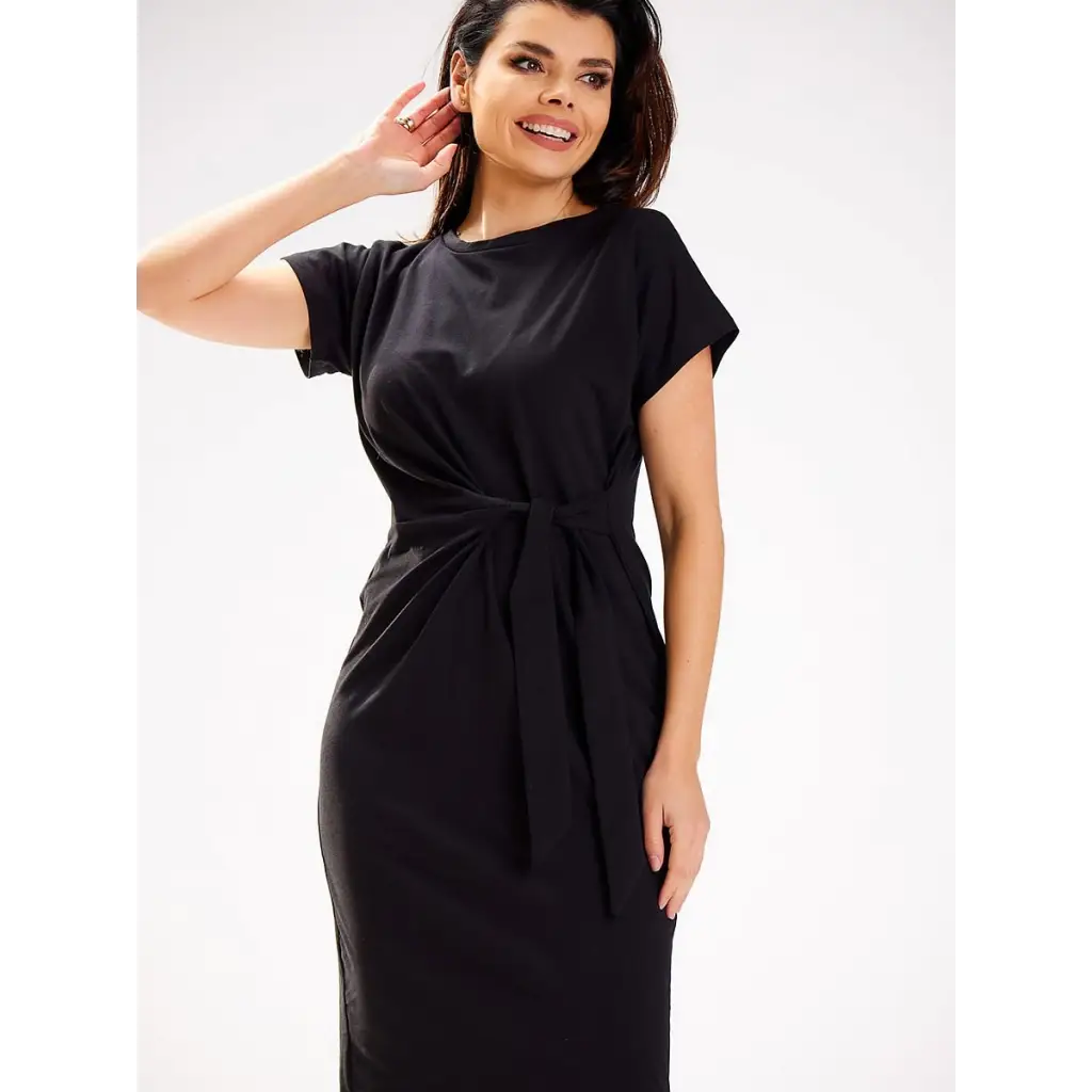 Midi dress with short sleeves. It has an asymmetrical binding on the front. Entirely made of body-pleasing cotton. Designed and sewn in Poland.