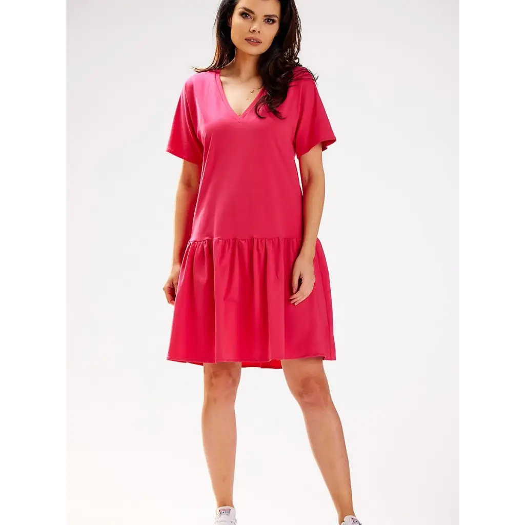 Dress in a loose style with short sleeves and a ruffle at the bottom. The loose cut will ensure comfortable wearing on warm days and the beautiful colors perfectly match any skin tone and beauty type, ensuring a perfect look in any situation. It will work great with both summer sandals and sneakers. Designed and sewn in Poland.