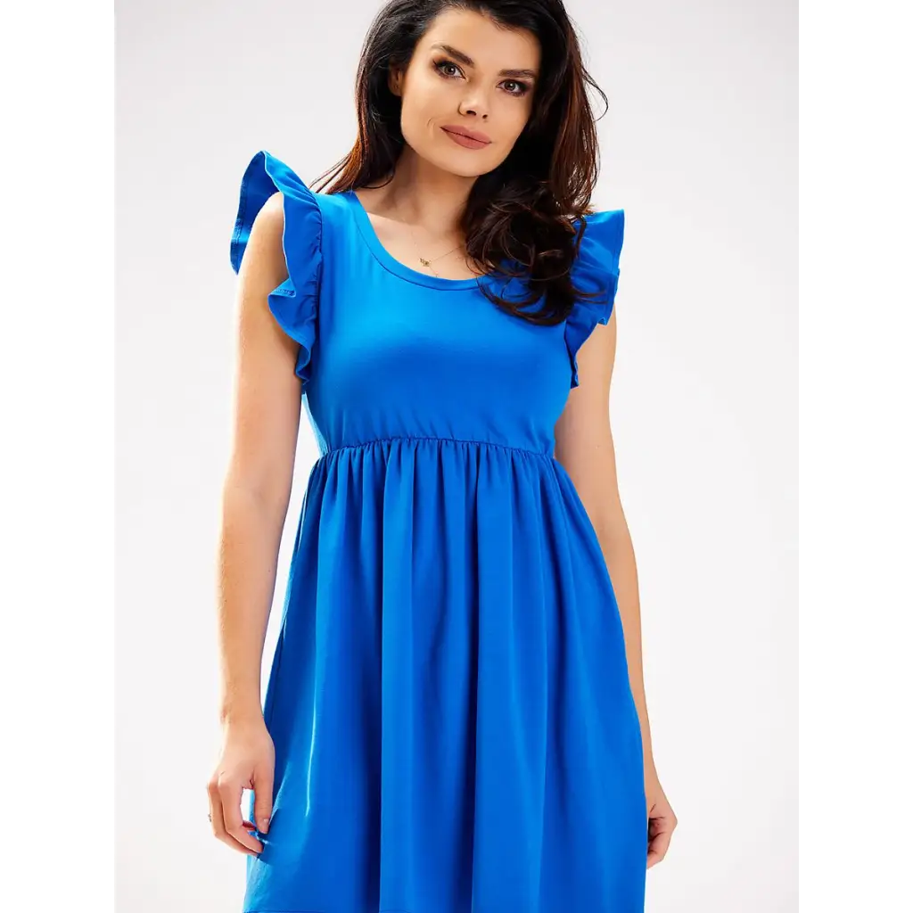 Mini length summer dress. Cut off with an elastic band under the bust. On the shoulders decorated with a frill. Designed and sewn in Poland.