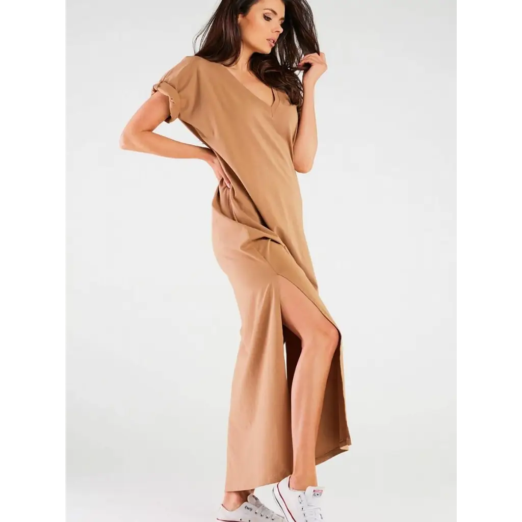 Extremely feminine dress with short sleeves. The banal form was broken by slits on the sides. Designed for women who like to emphasize their shapes. The maxi length allows to optically slim the figure and emphasize all the strengths of women. Designed and sewn in Poland.