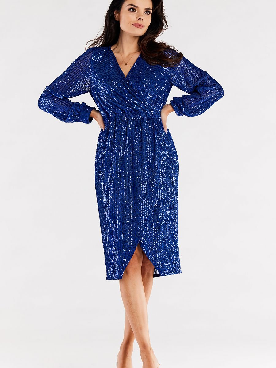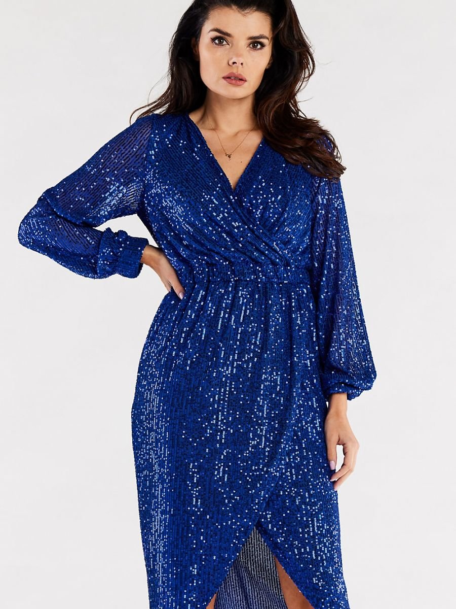 Sequined envelope dress with wider sleeves and a ruffle at the cuff. Wide elastic at the waist for a snug fit. The dress is sewn with elastic lining. The dress is made in Poland.