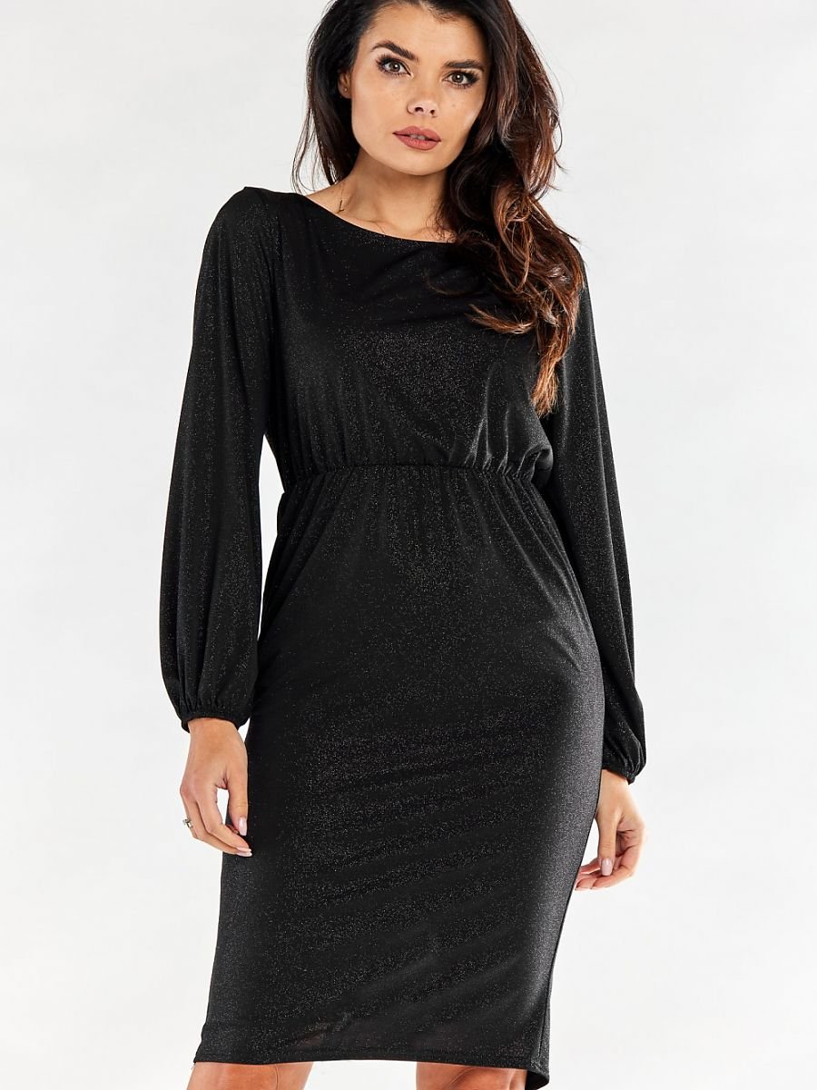Elegant dress made of fine fabric and with an exposed back, and binding between the shoulders. Long sleeve, creased at the wrist with an elastic band. At the waist is creased with an elastic band to fit the figure. The dress is sewn on an elastic lining. The dress is made in Poland.