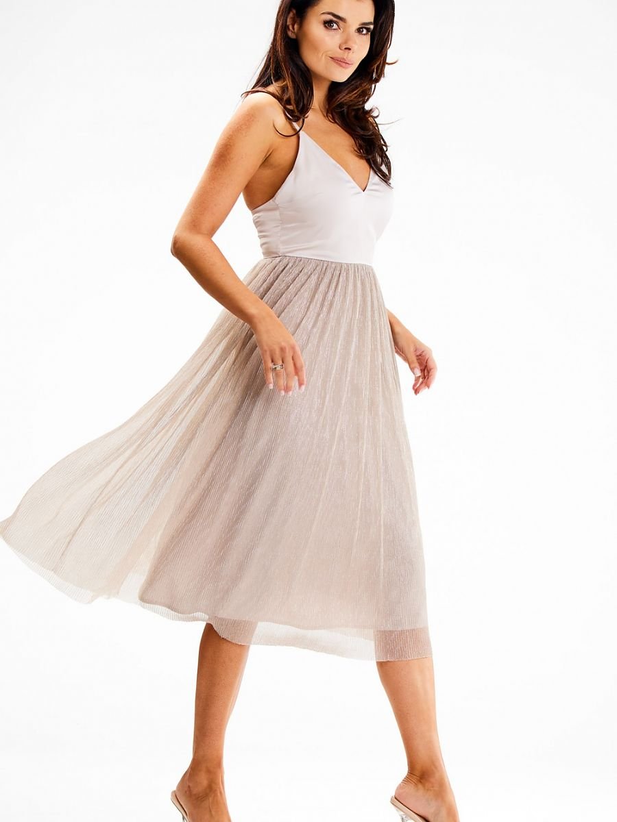 Midi dress with a fitted, satin strapless top that perfectly emphasizes the feminine curves. The flared bottom was made of shiny mesh on a lining.