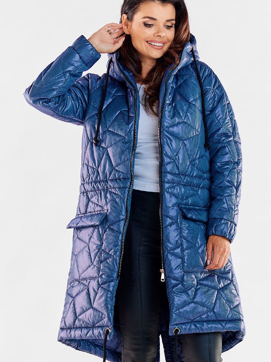 Quilted jacket with knee length, extended back with hood and straight sleeves. Widened towards the bottom, with a drawstring waist, zippered. It will work well as a rain jacket. The jacket is fully lined. The jacket is designed and sewn in Poland.