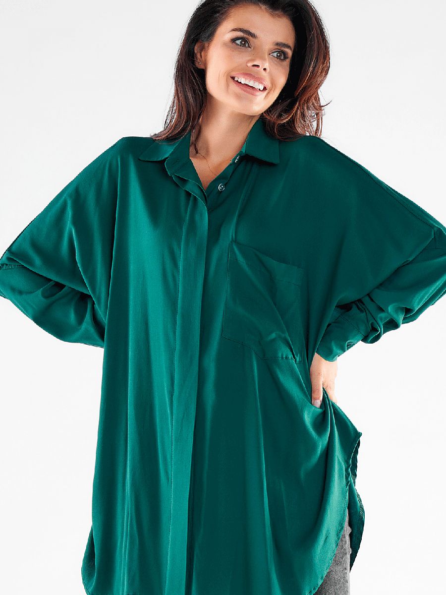 Long sleeve oversize shirt with a loose fit. It fits with skirts, pants and can also be used as a dress. Such a shirt will be perfect for a variety of styling with stilettos, sneakers for everyday and evening. It is very feminine and original. Made of fabric that fits beautifully when worn. The product was manufactured in Poland.