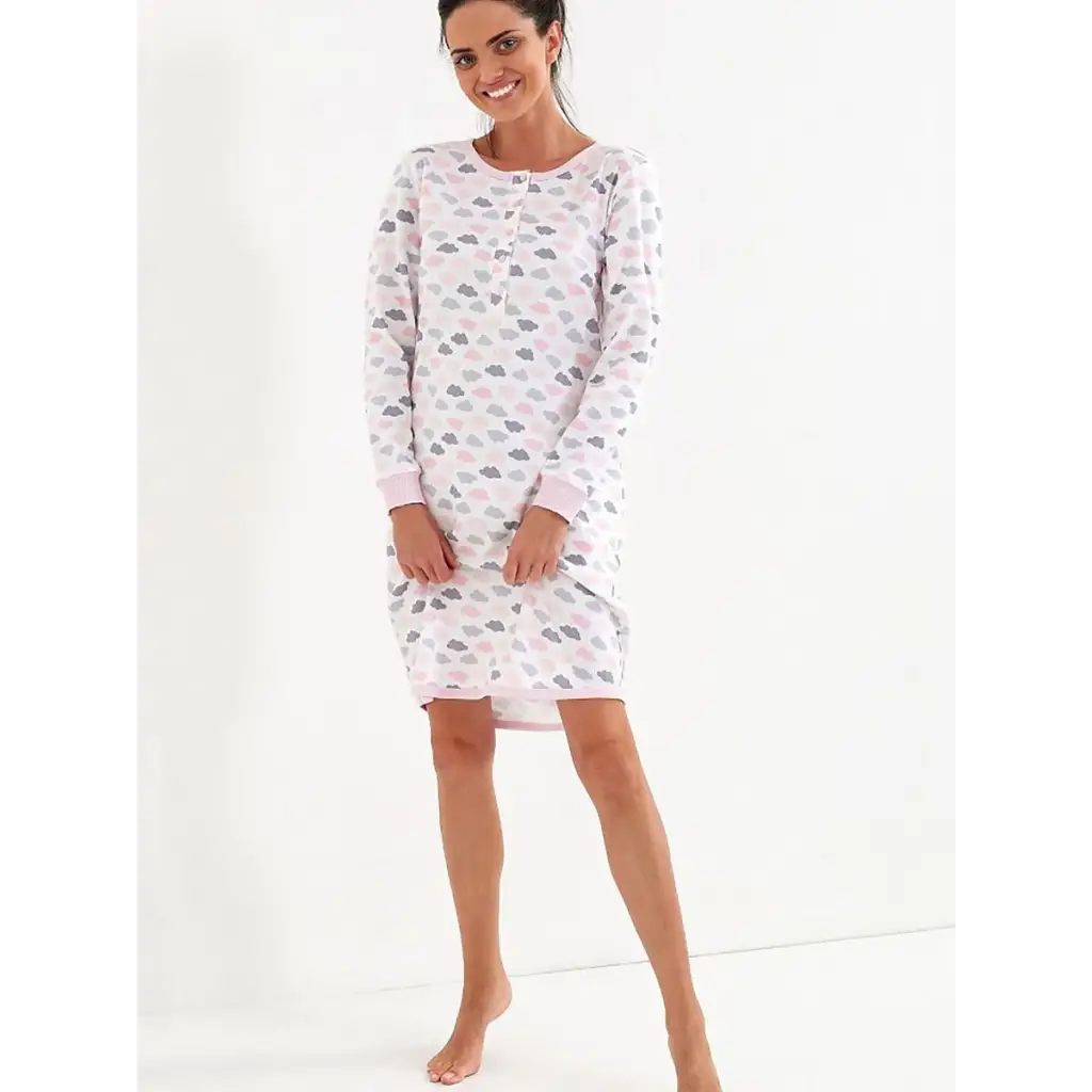 Phenomenal nightgown 208 was created from refined interlock fabric, 100% cotton. The whole is decorated with a pattern of pink and gray clouds. The shirt has long sleeves, a round neckline with unbuttoned, pearl buttons. The shirt has a comfortable, loose fit. The bottom is gently cut at the sides. The neckline and cuffs finished with a pink stripe.