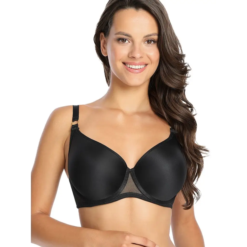 Great fitting black model with M10 design. Thanks to the thermally molded cups, the bra has no seams on the cup and does not irritate the delicate skin of the breasts. The back is made of cabaret, lined with delicate elastic mesh. It does not irritate the skin, no side whalebones, soft circumference. The middle of the medium height together with the cups form a tulip-shaped neckline, perfectly exposes the breasts.