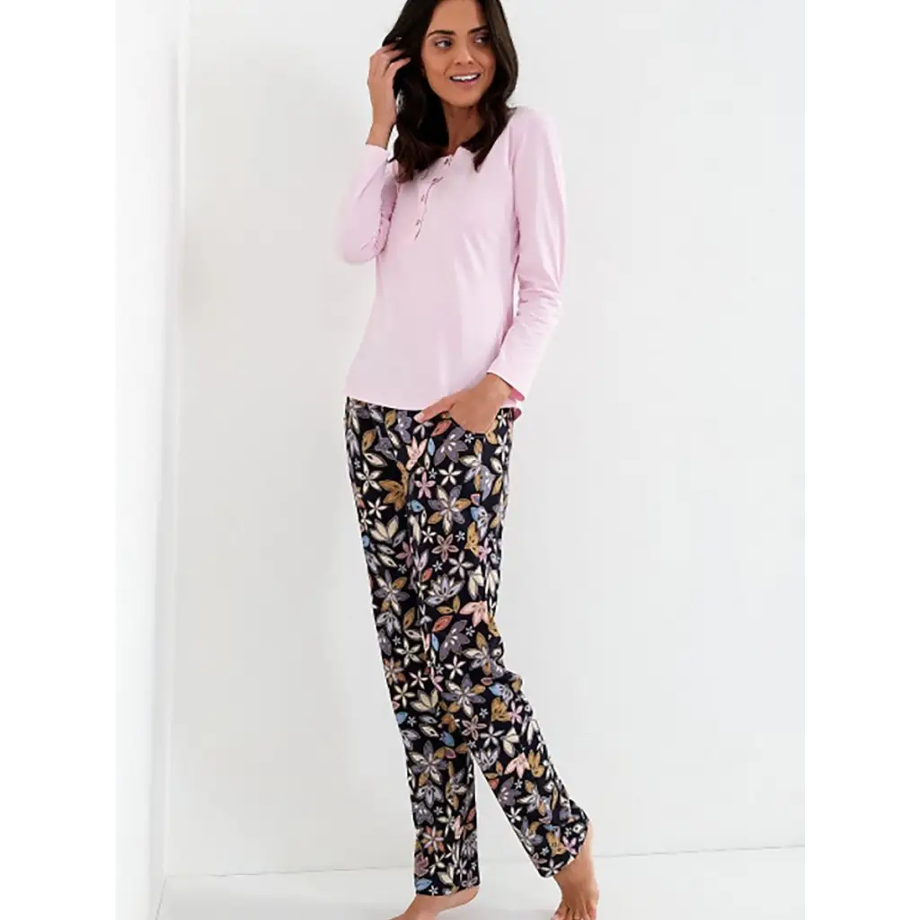 Women's pajamas model 197 is a great option for cold nights. It is made of 100% jersey cotton. The set consists of a classic, waisted long-sleeve blouse in cool pink. The polo neckline with unbuttoned mother-of-pearl buttons. The whole set is complemented by long, straight pants in colorful geometric flowers. There are stitched, practical pockets at hip level.