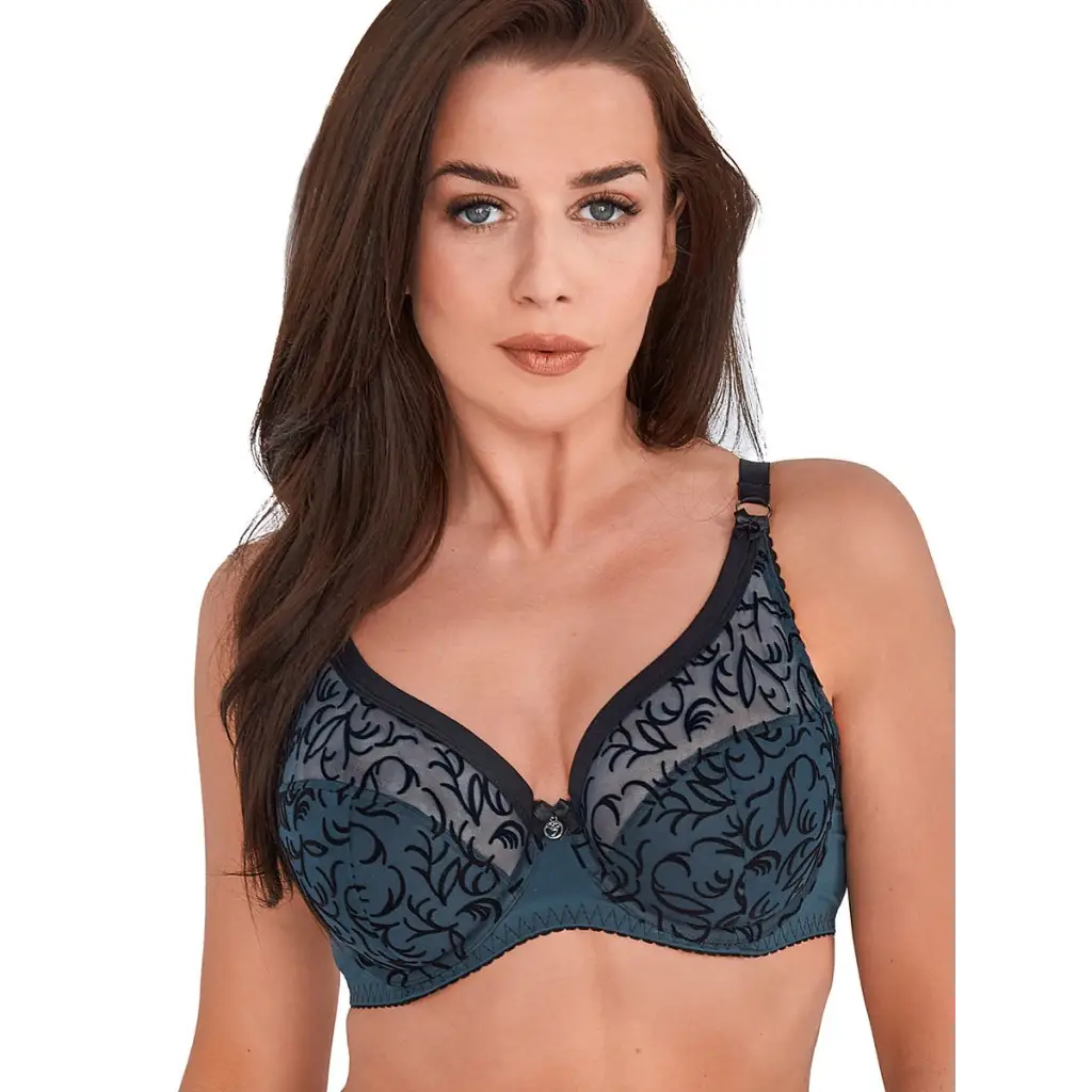 Semi-padded model Adaline with SS5 design in an updated version. Beautiful turquoise bra with a cup extended to the strap, with a classic design. Whole cup of stretch knit with flock pattern (lightweight knit with velour pattern). Back whole, made of thick smooth microfiber. The cut is medium built, the raised cut of the lower cup covers the nipple, the vertical cut on the lower cup makes the bra adhere well to the breast. The middle of the bra of medium height, accurately adheres to the bridge, great for under a blouse with a larger neckline, the perimeter of the model without side whalebones. The model firmly collects the breasts and gives them a round shape.