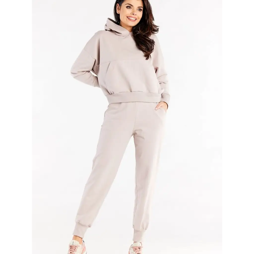 Loose sweatshirt with long sleeves, hood and decorative stitching on the front. A large kangaroo pocket on the front.